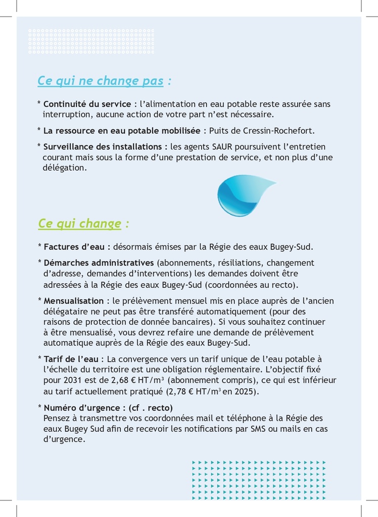 / Eau potable - changement de gestion au 1er avril